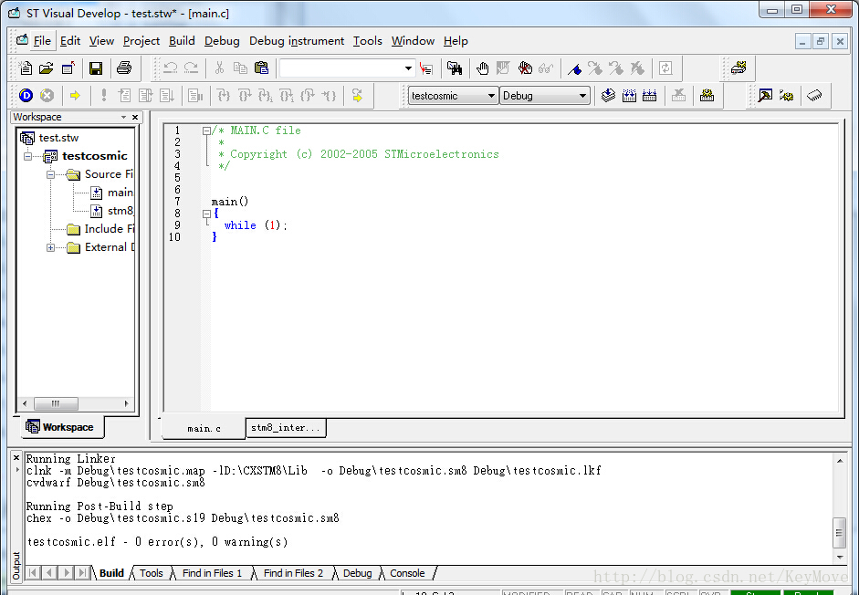 这样工程已经建立完成,能看到一个main.c和一个stm8_interrupt_vector.c