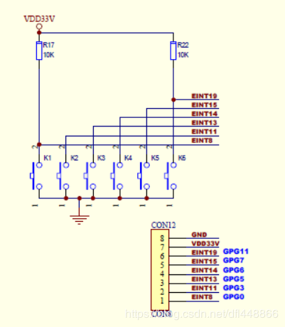 端口上拉寄存器控制每个端口组的使能/禁止上拉电阻。当相应位为0 时使能引脚的上拉电阻。当为1 时禁止上拉电阻。如果使能了上拉电阻,那么上拉电阻与引脚的功能设置无关(输入、输出、DATAn、EINTn 等等)