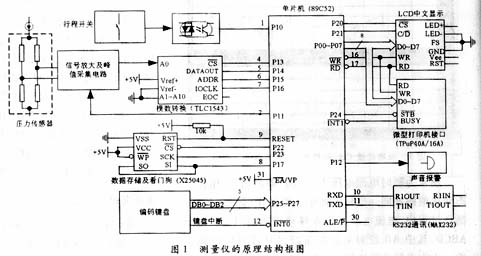 吨位测量仪的硬件结构框图如图1所示。行程开关主要检测锻压设备打击锤的起落信号,并将该信号经光电隔离后送入单片机。压力传感器所检测的压力经信号放大及峰值(打击力最大值)采集电路处理后进入带片内采样保持的模数转换器TLC1543,在单片机AT89C52的控制下对模拟信号进行转换和读取。单片机的P11引脚对峰值采集电路进行控制。当仪表设置成打击模式下对每锤打击力最大值测量时,P11输出低电平,峰值采集保持电路起峰值保持作用,单片机根据行程开关所测得的信号对每一次打击的力的最大值进行采样;当仪表对压力值进行实时跟踪测量时,P11输出高电平,峰值保持器功能被旁路,峰值保持电路输出电压紧紧跟随其输入电压。X25045为内带512字节的串行EEPROM及看门狗和电压监控功能的集成芯片,用来对打击次数、打击峰值及各次打击力等数据进行记录,并对仪器的工作起抗干扰作用。当压力超载时,单片机引脚P12发出信号控制电铃发出声音报警。LCD中文显示模块和编码键盘实现人机操作及测量显示。仪表带有打印机接口,可以驱动微型打印机TPuP40A将记录数据打印出来;并通过RS232与上位机通讯。