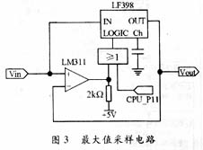 图3是打击模式下对打击力峰值进行采集并保持的电路,由比较器LM311及采样保持芯片LF398构成。LF398的LOGIC引脚为采样/保持控制引脚,当LOGIC引脚电压大于1.4V时,芯片的输出电压大小跟踪输入;当LOGIC引脚电压小于1.4V时,芯片的输出保持为当LOGIC引脚刚过1.4V时的输入电压值。