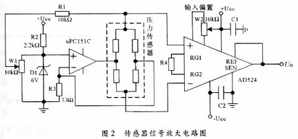 由于要对微弱信号进行高倍数放大,而且传感器桥路输出信号的共模电压很高,这里采用了具有高共模抑制比的差分输入专用仪表放大器芯片AD524。按图2电路中的接法,电路的放大倍数