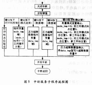 在测量仪的软件设计中,采用了模块化设计方法。系统软件由以下几个模块构成:主程序、键盘中断服务子程序、数据采集控制子程序、LCD显示子程序、打印程序、串口通讯子程序等。主程序及键盘中断服务子程序的结构如图4、图5所示。主程序中的工作模式标志、新工件标志、打印机使能、测量力超载门限值等数据均由键盘中断来设置。键盘设置5个按键,键值经过8—3编码后通过3根IO口线输入到CPU。键盘中断置为下跳沿触发方式,在硬件上设计有键盘去抖动电路。数据采集控制子程序中在进行数据采样时进行了滤波处理。程序设计采用C语言,并在KEIL C集成环境下完成程序的调试工作。
