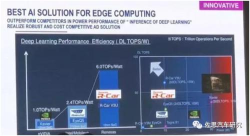 第四代 R-CAR 大约在 2023 年量产,而 V3U 也是第四代产品,预计将在 2022 年量产,这是一款 12 纳米芯片。瑞萨表示 12nm 工艺 R-Car SoC V3U 的 AI 性能可以达到 6.0TOPs/W,远高于英伟达的 Xavier 平台和 Mobileye 的 EyeQ5 平台。