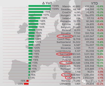 从目前的发展来看,如果疫情继续发展下去,对于欧洲市场,汽车销量的影响很多消费者也会减少外出,普通出于安全的考虑暂缓进店选购,这一波欧洲股市的下跌也预示着疫情也会影响欧洲的经济,然后和国内市场一样进而影响消费力和意愿,这个是节奏上基本是相似的。如下图所示,意大利的 200 万市场短期内需要打个问号,附近的法国、西班牙和德国市场,还要根据后续的发展来看。根据行业大致的预期,原本预期 2020 年欧洲汽车市场整体下跌 3%,这么一来如果好一些可能在 5-10%的影响,如果也一个个国家出现问题,可能对汽车消费可能会造成 15%以上的销量影响。