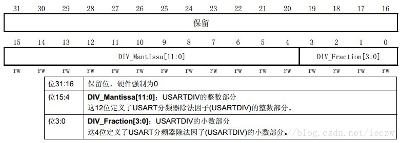 USARTDIV计算出来,然后需要换算成USART_BRR寄存器需要的模式:我们呢可以先来研究下BRR寄存器: