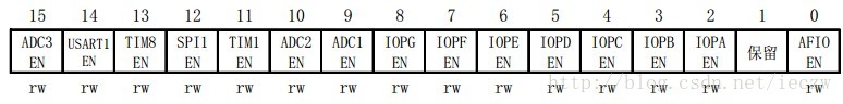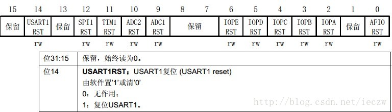 APB2ENR寄存器如下,我们要使能IOPA和USART1的时钟所以,APB2ENR |= (1<<2) | (1<<14)