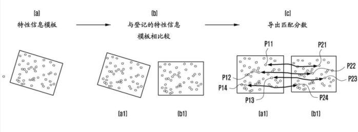 如下图为电子设备中比较指纹信息以便执行指纹认证的图示,通过特征信息模板,来导出用于识别用户身份的关键匹配分数。