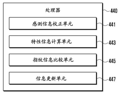 如上图所示为处理器的配置结构图,可以看到其中包含感测信息矫正单元441、特性信息计算单元443、指纹信息比较单元445以及信息更新单元447。