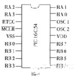 PIC16C54 单片机是8位单片机,它采用精简指令集(RISC)和 Harvard 总线结构,其数据总线是 8 位,指令总线则是 12 位。这意味着 PIC 的一个指令字长比采用 CISC 指令集的 8 位字长的单片机指令包含更多的处理信息。它仅有 33 条指令,且均为单字指令。它的工作电压为 2.5~6.0V,内部有自振式看门狗(WDT),且具有保密可熔断丝,保护程序不被拷贝。该芯片(见图2)具有 0.5K 程序存储器(ROM),25 个内部寄存器组(RAM), 8 个特殊功能寄存器,2级子程序堆栈。它的各引脚功能如下: