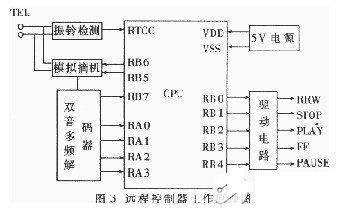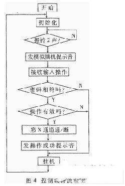 假设系统的密码为 99,录像机放像的操作码为 4#。当操作人员拨通控制目标电话号码时开始振铃,当 CPU 连续收到 2 次振铃时 RB5 端输出高电平,致使外线电压降至 5V 左右,接通话路,此时,CPU 发模拟摘机提示音,操作人员听到提示音后,可以连续输入密码和操作码。当密码有效且操作码正确时(如 994#),对应的输出端 RB2 端输出高电平,同时发操作成功提示音,然后系统自动挂机。若密码或操作码无效,则系统直接挂机不发提示音。