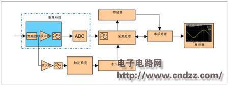 输入放大器对被测信号进行调节,使其幅值与 ADC 和显示器的工作范围相匹配,经过调节的信号从放大器输出之后会并行发送至模-数转换器 (ADC) 以及触发系统。