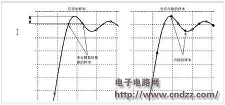 如图 7 所示,通过2倍插入方式将采样分辨率提高两倍,从而减少信号的“盲”区。左图的波形采样中并未包含波形图中过冲部分,并且 基于ADC 样本的触发门限无法检测到过冲发生。右图通过插值的方式将波形采样率提高两倍,因此过冲能够引起触发。过冲的最高频率为 3.5 GHz,因此当 ADC以10GS/s采样率工作的时候数字触发系统能够检测到高频分量。