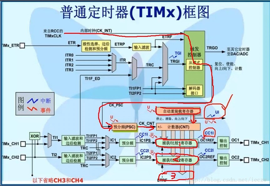我们先看看这个逻辑图吧!我们今天先讨论讨论定时器的问题!我用红色笔标过的路线就是定时器的工作路线,时钟有内部时钟产生,到PSC哪里进行分频处理,然后CNT进行计数,上面还有一个自动重装载寄存器APP。