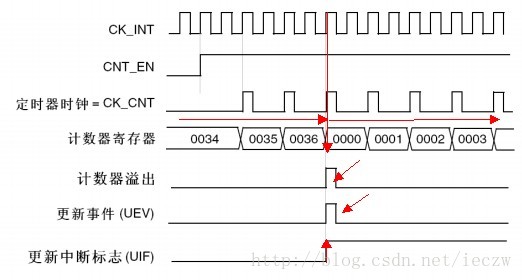 这个是计数过程,上面说过了,计数跟分频后的周期有关;当计数达到装载的数值之后,系统会产生一个三个信号,其中溢出信号和更新事件一个时钟周期后会自动消失,而这时候触发了更新中断标志位UIF,我们可以用这个UPDATE来做定时器的中断标志信号!