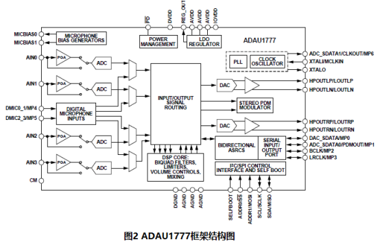 如图2所示ADAU1777框架结构图, ADAU1777具有快速高精度(高达768 kHz)采样处理路径,5μs analog-to-analog延迟,保证了DSP处理滤波器速度和精度;4个ADC模拟输入,可配置为麦克风或线路输入;同时,两路数字麦克风输入可作为选通输入。基于以上性能,ADAU1777已在国内外各大耳机ODM厂商都有成熟产品的应用和量产。