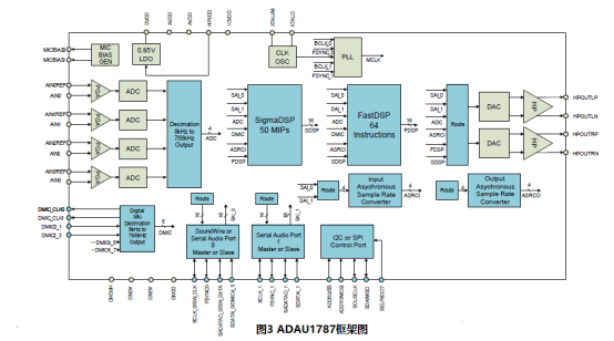如图3所示 ADAU1787框架图,ADAU1787具有独特的双核设计,FastDSP 核做主动降噪滤波器处理,同时SigmaDSP核做EQ后处理,对降噪处理后损失的音乐中低频部分做补偿。
