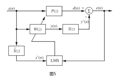 一共三层,用虚线分隔:最上面一层primary path是从Ref Mic到Error Mic的声学通道,响应函数用P(Z)来表示;中间一层是模拟通道,其中secondary path是adaptive filter输出到返回残差的通路,包括DAC、reconstruction filter、power amplifier、speaker播放、再采集、pre-amplifier、anti-aliasing filter、ADC;最下面一层是数字通路,其中adaptive filter不断调整滤波器权系数来削减残差,直到收敛。最常用的方案是用FIR滤波器结合LMS算法来实现自适应滤波器。简化图4,可以得到图5。