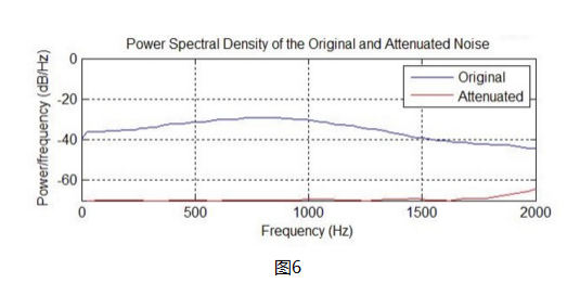 这里adaptive filter输出后经过S(z)和desire output比较后,可能会引起instability。一种有效的方法是FXLMS(Filtered-X LMS),也就让x(n)经过Sˆ(z)S^(z)再输入给LMS 模块, 使adaptive filter可以正常收敛。也就是说,自适应滤波器的权系数是由耳机的primary path和secondary path决定的。耳机的primary path和secondary path相对稳定,所以adaptive filter的权系数也相对稳定。用变步长LMS的adaptive filter,得仿真结果如图6,在0到2KHz范围内(图6)。