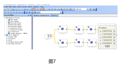 最后,需要在ADI Sigmastudio 图形化工具对Matlab仿真系数做相应滤波器参数的代入和调整(图7),而这部分调试需要和耳机声学曲线测试做反复验证。