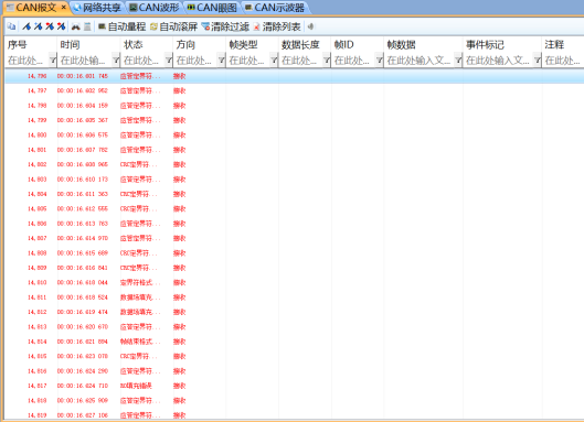 前段时间有个用户反馈说自己的设备启动后多个节点处于失控状态,用CANScope测试全是错误帧如图1所示。