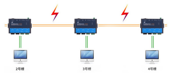 怎么能彻底解决强干扰带来的隐患呢?只要数据的传输不依赖电信号就能完全隔离掉干扰。光纤作为一种无法被电磁干扰的传输介质,我们可以把 CAN 容易受到干扰的部分使用光信号传输,增加CAN转光纤转换器。如图3所示,为使用致远电子的三台CANSwitch-AF2S2组合的光纤主干网络。