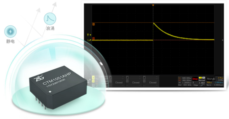 如下图所示的CTM1051(A)HP模块内部集成高可靠的浪涌防护电路,静电放电抗扰度高达8kV,雷击浪涌抗扰度高达4kV,可有效解决工业现场因静电、浪涌干扰而导致的通讯异常问题。