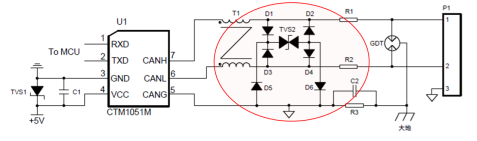 TVS二极管并联在信号线和信号地线之间,用来保护电缆受到雷击或静电放电时产生的浪涌高压。当 TVS 上的电压超过一定的幅度时,器件迅速导通,从而将浪涌能量泄放掉,并将电压的幅度限制在一定的范围内。在这里建议在 CANH、CANL信号线上使用两个 TVS管进行双向保护,如下图所示。