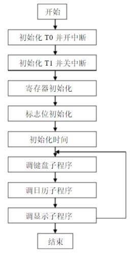 从上面主程序看出,主程序的组成是通过分别调用各子程序组成总体系统功 能,能很直观的看出主程序所要完成的功能,首先是初始化各模块,之后调用键 盘完成时间的调整,调用日历子程序完成日历时钟的初始化和时间数据的读写,调用显示子程序显示数据,最后又转到键盘程序来回循环。