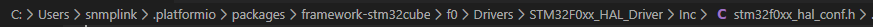 低于PlatformIO开发平台,如果更改外部晶振频率,需修正stm32f0xx_hal_conf.h文件,原先使用keil开发时,此文件和项目相关,可以单独修改,但是在PlatformIO平台上,则此文件的路径如下: