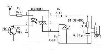 该电路主要由光电耦合器和可控硅组成,如图所示。单片机发出的控制信号(PWM)经驱动器后控制光电耦合器的工作状态。当光电耦合器工作后,使双向可控硅的触发极处于高电平,可控硅处于导通状态,进而控制加热棒的工作。
