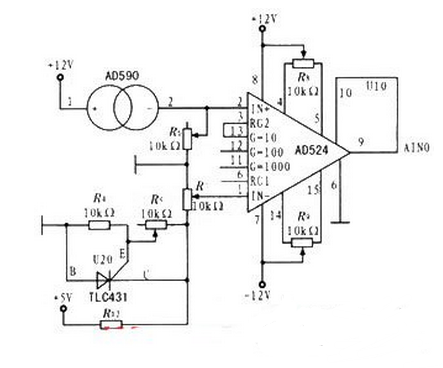 图为温度采集电路。该电路主要由温度传感器AD590和差分运算放大器AD524组成,其中温度传感器AD590是一种新型的两端式恒流器件。激励电压范围是4~30 V,测温范围为-55~+150℃。当AD590的电流流过一个5 kΩ的电阻时,温度升高1 K,该电阻上的电压增加5 mV,即转换成5 mV/K。因此,温度在0~100℃间变化时,电阻电压在1.365~1.865 V间变化。运算放大器AD524用于把绝对温度转换成摄氏温度。