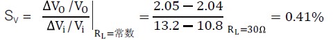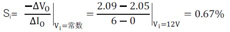 电压调整率即负载固定时,输入电压的波动对输出电压的影响(即输出电压的变化量与输入电压变化量的比值)。以输出电流6A 时对应的输出电压2.04V,2.05V,2.05V,输入电压10.8V,12.0V,13.2V(如表1),计算电压调整率: