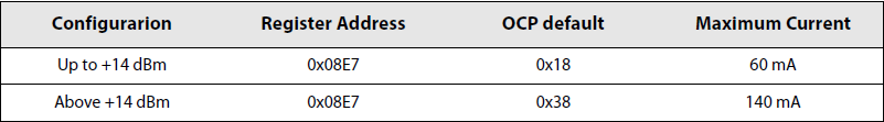 The OCP is configurable by steps of 2.5 mA and the default value is re-configured automatically each time the function SetPaConfig(...) is called. If the user wants to adjust the OCP value, it is necessary to change the register as a second step after