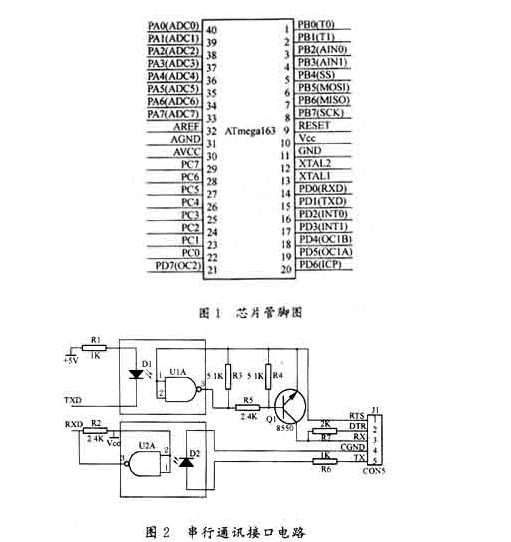 Atmega163具有16K字节的Flash存储器,512字节在线可编程E2PROM,1024字节SRAM,外围有全双工UART串行通讯接口。此外,它还有2个具有比较模式的可预分频的8位定时器/计数器,1个可预分频,具有比较、捕捉功能的16位定时器/计数器。