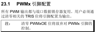 PWM的输出引脚通过PWMxCON寄存器的第7位 PWM 模块使能位(PWMxEN)配置为PWM输出