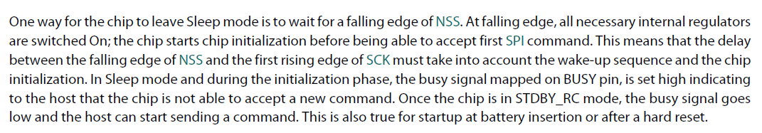 可以通过NSS的下降沿使得芯片从sleep模式唤醒。下降沿发生后,芯片内部的稳压器都将打开。芯片开始初始化,然后具备接收第1个SPI命令的能力。这意味着NSS下降沿到SCK上升沿之间的延时,需考虑唤醒序列和芯片的初始化。在睡眠模式和初始化阶段,BUSY引脚为高电平,以表明芯片不能够接收1个新的命令。一旦芯片进入了STDBY_RC模式,BUSY引脚将变低,此时主机可以发送命令。整个过程同样适用于上电启动和硬复位。