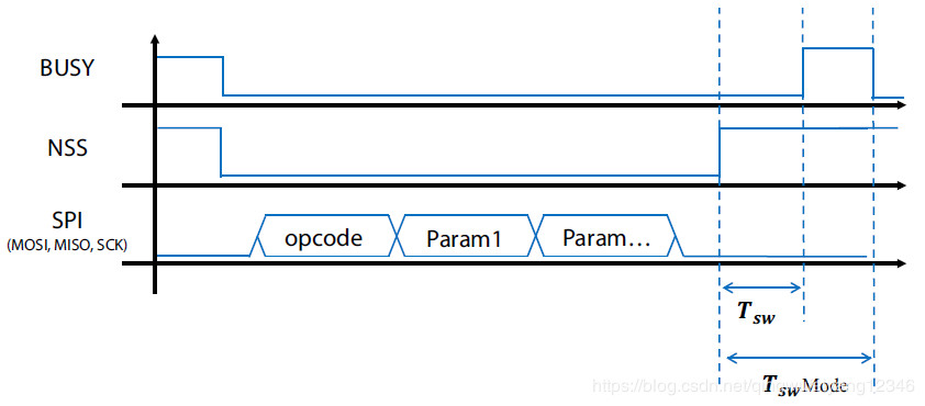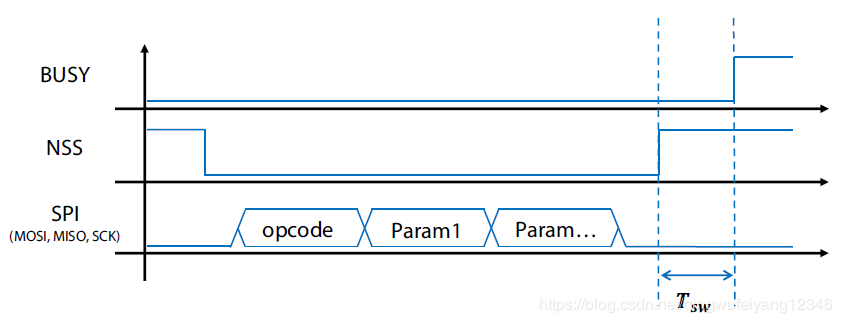 5、SX126xWaitOnBusy函数比较简单,只是判断BUSY引脚变为低电平后,命令处理结束。在这里需要注意的是,NSS调高后,须经Tsw的时间,BUSY才为高,但Tsw的时间为600ns极短,所以我们可以直接调用SX126xWaitOnBusy函数。