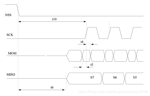 2、几个时序图,t10是指从睡眠状态唤醒,NSS下降沿到SCK上升沿的时间,数据手册表明最短时间为100us。