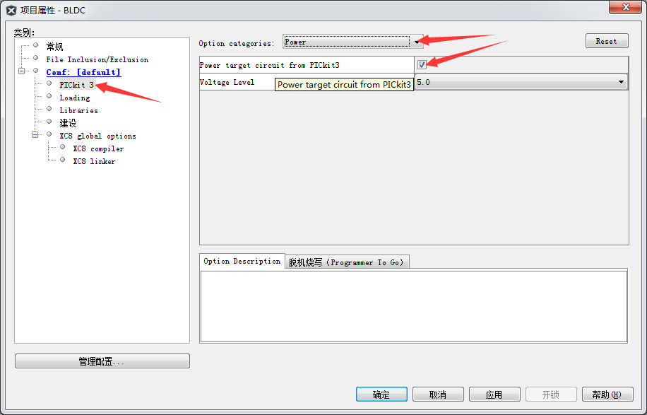 当从MPLAB 8.x转到这时,可能想找到供电的选项在哪里,右键工程名字-->属性,就可以找到,如下图所示。有时候下载时会出现一些错误,可以考虑下是否没有供电导致的。若下载时出现电压不足的错误,但实际电压确实没问题的话,需要重启开发环境。