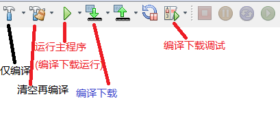 刚使用时发现按钮比较多,下面是常用的几个,若需要在线调试,直接按右侧的那个按钮就可以,这个按钮包含编译下载调试,调试所需要的开始暂停复位功能在下图右侧。不得不说,这个开发环境在线调试实在是烂,有时都无法调试,只能重新打开工程,重新上电,可能与下载器有关,使用的是kit3,这个和Jlink相比差远了!