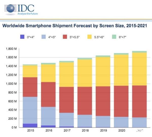 IDC的一份预测智能手机屏幕发展的报告显示,尽管5英寸以下屏幕尺寸的智能手机份额将持续缩减,但到2021年仍将保持10%左右的出货量。