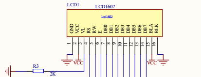 LCD1602模块的命令操作端有RS、RW和EN,单片机的P2^5、P2^6、P2^7脚分别与之相连。数据端口DB0~DB7分别接在单片机的P0^0~P0^7。为了保持LCD1602液晶具有较高的亮度,一般电路设计中都会将VL端串联一个2K的电阻接地。