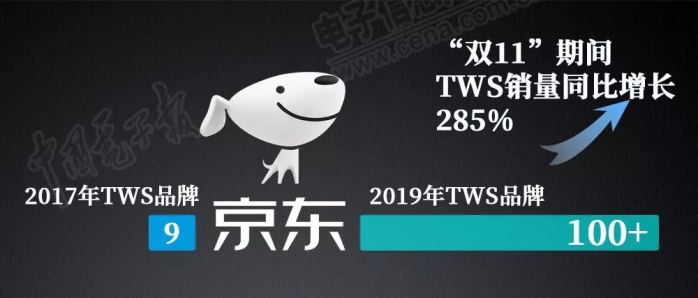 谭倩倩告诉记者,2017年京东平台的TWS品牌仅有9个,2019年突破百家。2019年“双11”期间,京东平台的TWS销量同比增长了285%。