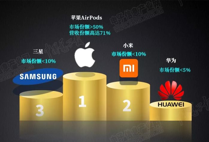 市场研究机构Strategy Analytics的报告显示,2019年TWS市场苹果AirPods一骑绝尘,市场份额达到50%,营收份额更是高达71%。小米和三星排在第二位、第三位,市场份额均不足10%。另一家中国厂商华为的份额不到5%。