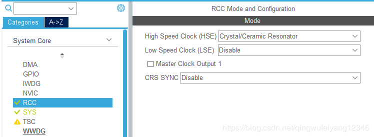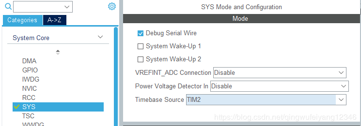 3、双击相应的芯片类型后,进入配置界面。进行SYS配置,选中Debug Serial Wire,由于我习惯于使用FreeRTOS所以在我的项目中Timebase Source都选择定时器。