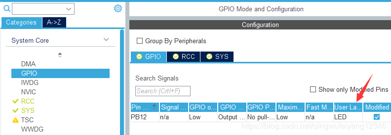7、在GPIO设置中,将LED引脚的User Label设置为LED。