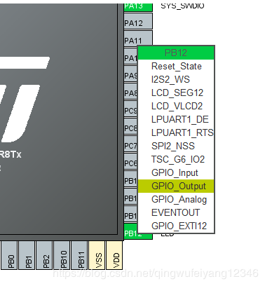 6、在芯片引脚图中,将连接LED的引脚设置为GPIO_Output