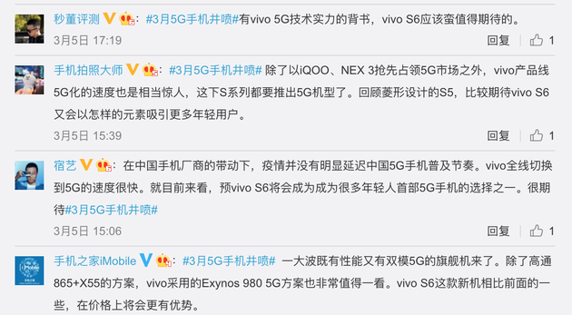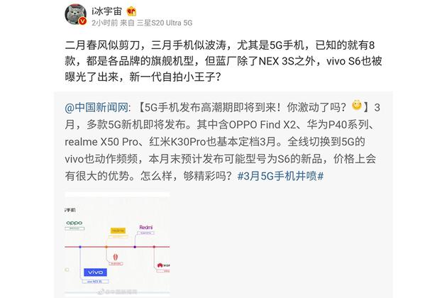 如果说今年所有品牌都把精力集中在了5G手机上,那今年3月似乎也成了大家推出新品最集中的一个月。上周,中国新闻网在微博上爆料显示整个三月有八款重磅5G手机发布,可能会成为今年上半年最集中的一次5G手机发布热潮。在这些手机里各位关心的是哪款呢?不少网友表示,作为压轴登场的vivo S6成功引起了他们注意,因为这也许是他们中间价格和定位最亲和的一款5G手机。