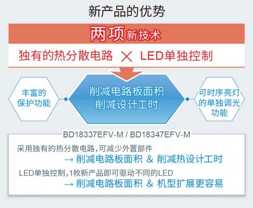 新产品采用了两项新技术:“热分散电路”和“LED 单独控制功能”,有助于显著削减 LED 灯的电路板面积和应用的设计周期。