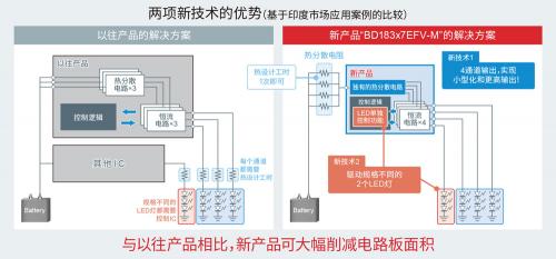新产品采用了两项新技术,即 ROHM 独有的热分散电路和 LED 单独控制功能,有助于显著削减 LED 灯的电路板面积和应用的设计周期,能够为以印度为主的海外两轮机动车市场提供解决方案。